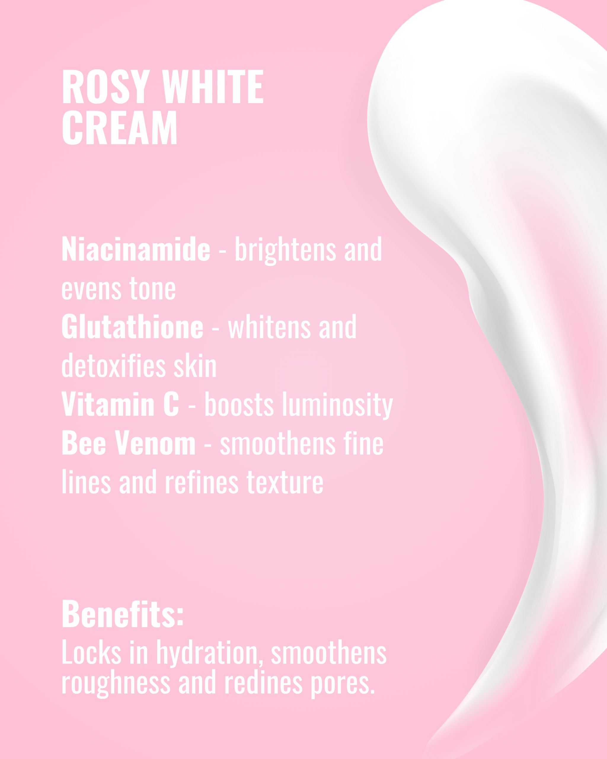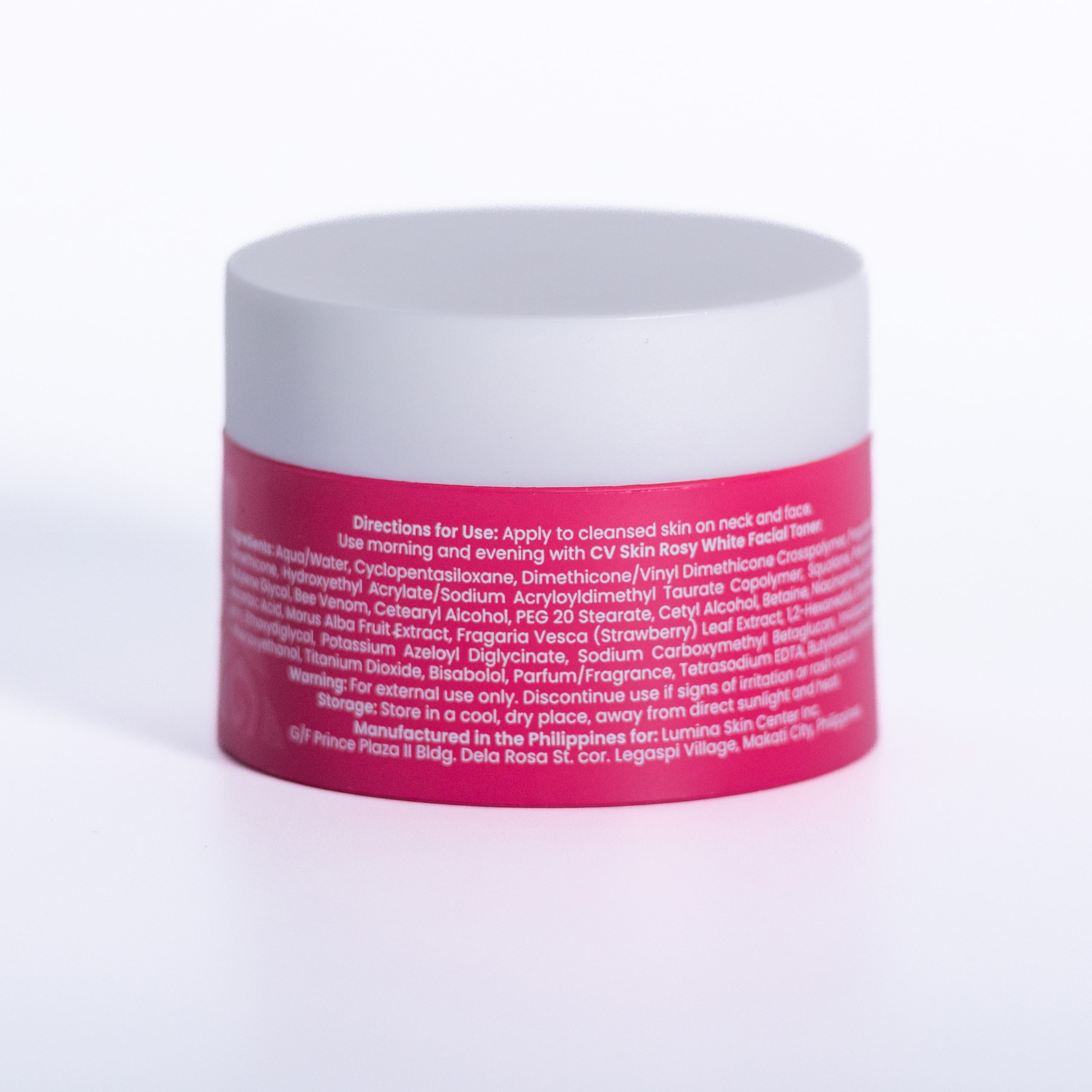 CV SKIN ROSY WHITE CREAM Is a skin-brightening and moisturizing cream formulated to promote a radiant and even complexion. Enriched with active ingredients, this cream helps reduce the appearance of dark spots and enhances skin's luminosity.