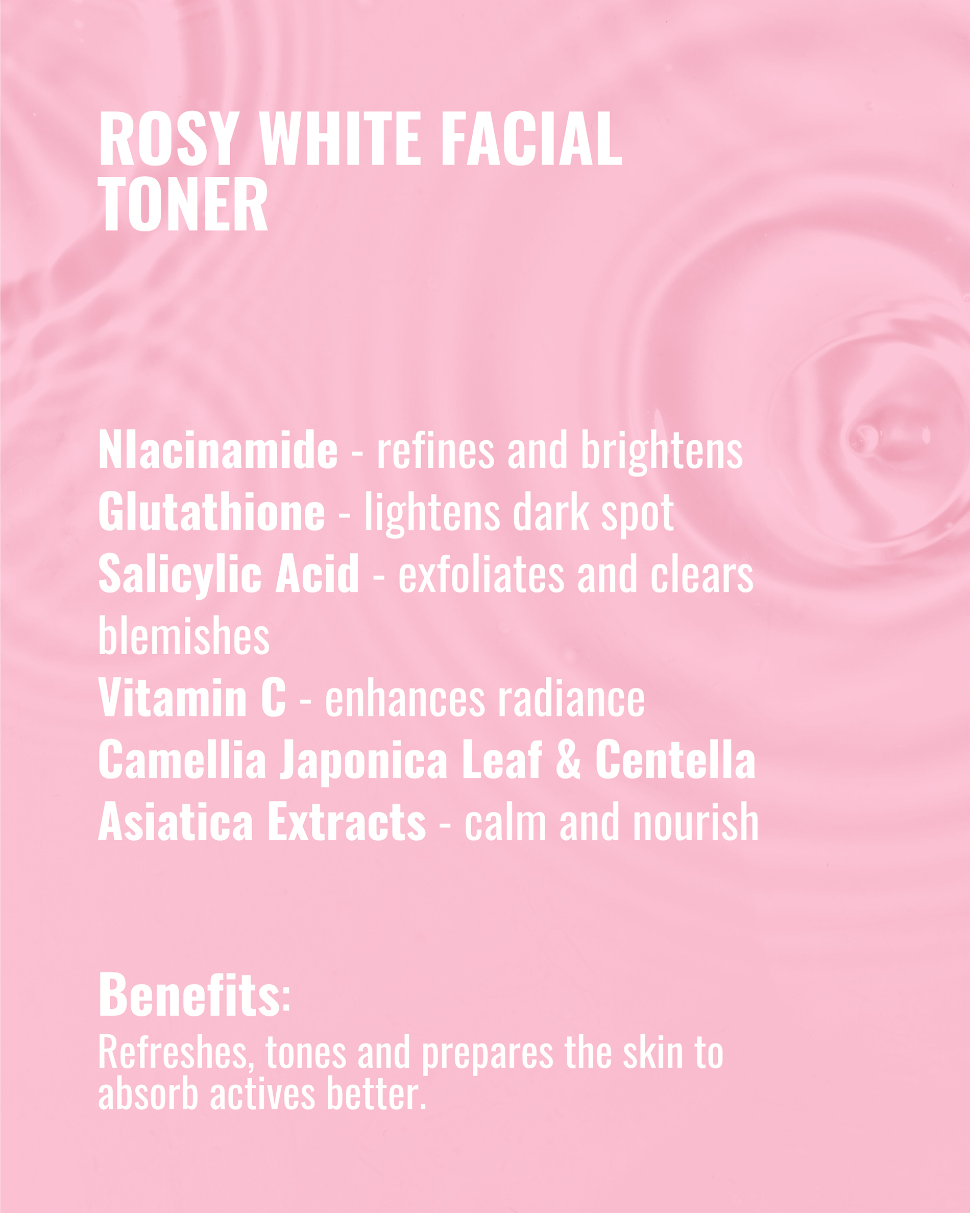 CV SKIN ROSY WHITE FACIAL TONER is a skin-enhancing solution designed to promote a brighter and more radiant complexion. Enriched with a blend of active ingredients, including Niacinamide, Ascorbic Acid, and natural extracts, this toner helps improve skin tone and texture.